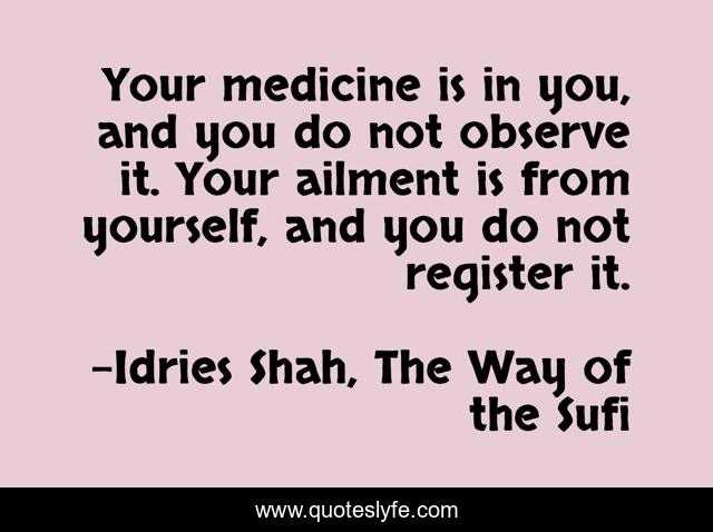 This page presents the quote "Your medicine is in you, and you do not observe it. Your ailment is from yourself, and you do not register it.". Author of this quote is Idries Shah, The Way of the Sufi. This quote is about sufism, sufis, hazrat-ali, wisdom,.
