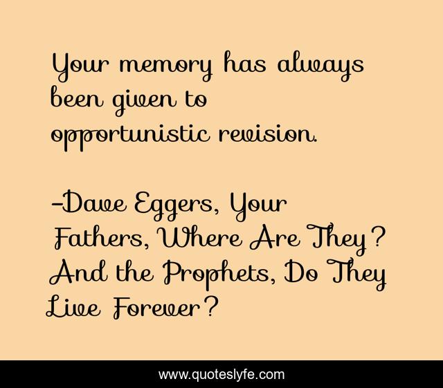 This page presents the quote "Your memory has always been given to opportunistic revision.". Author of this quote is Dave Eggers, Your Fathers, Where Are They? And the Prophets, Do They Live Forever?. This quote is about humour, memory,.