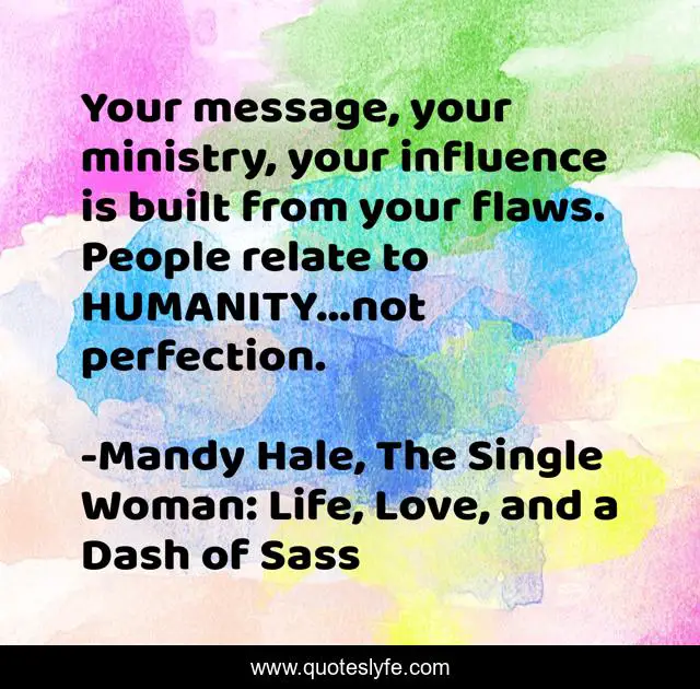 This page presents the quote "Your message, your ministry, your influence is built from your flaws. People relate to HUMANITY...not perfection.". Author of this quote is Mandy Hale, The Single Woman: Life, Love, and a Dash of Sass. This quote is about accepting-yourself, faith, flaws, destiny, greater-calling, ministry, god, sphere-of-influence, humanity,.