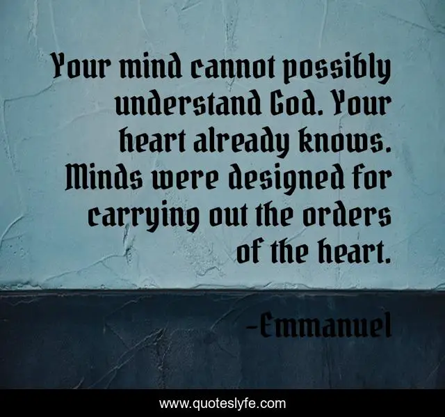 This page presents the quote "Your mind cannot possibly understand God. Your heart already knows. Minds were designed for carrying out the orders of the heart.". Author of this quote is Emmanuel. .