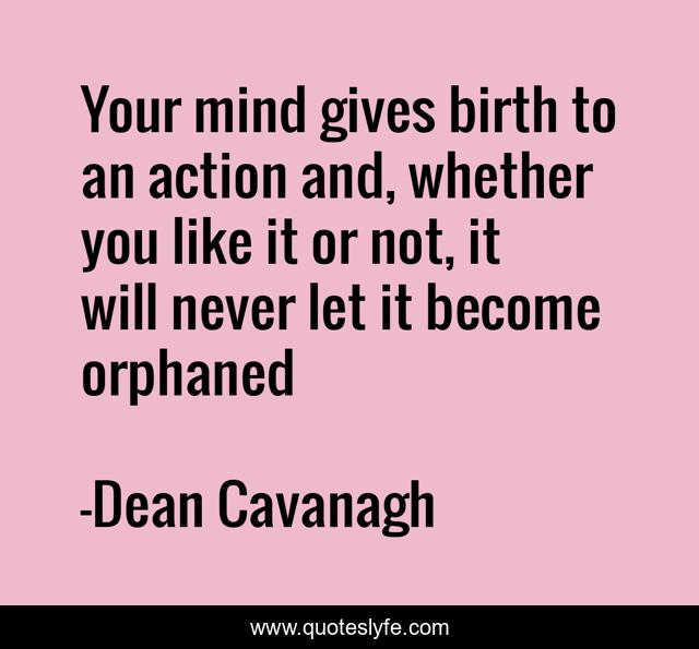 This page presents the quote "Your mind gives birth to an action and, whether you like it or not, it will never let it become orphaned". Author of this quote is Dean Cavanagh. This quote is about action, mind,.