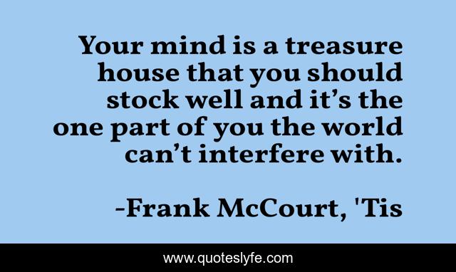 This page presents the quote "Your mind is a treasure house that you should stock well and it’s the one part of you the world can’t interfere with.". Author of this quote is Frank McCourt, 'Tis. This quote is about self, education, power,.