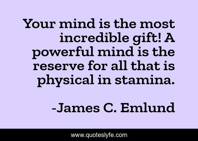 This page presents the quote "Your mind is the most incredible gift! A powerful mind is the reserve for all that is physical in stamina.". Author of this quote is James C. Emlund. This quote is about knowledge, intelligence, mind, personal-courage, stamina, inspirational, fortitude, enthusiasm, wisdom,.