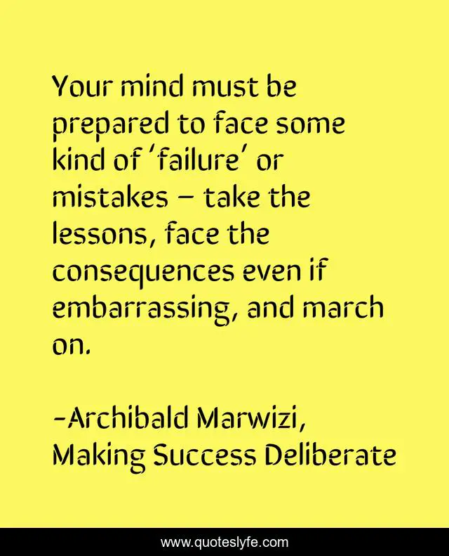 This page presents the quote "Your mind must be prepared to face some kind of ‘failure’ or mistakes – take the lessons, face the consequences even if embarrassing, and march on.". Author of this quote is Archibald Marwizi, Making Success Deliberate. This quote is about life, success, behaviour, attitude, legacy, growth, purpose, inspirational, leadership,.