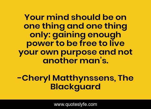 This page presents the quote "Your mind should be on one thing and one thing only: gaining enough power to be free to live your own purpose and not another man’s.". Author of this quote is Cheryl Matthynssens, The Blackguard. This quote is about freedom, live, purpose, power,.