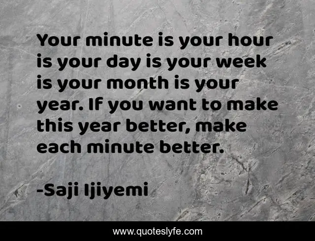 This page presents the quote "Your minute is your hour is your day is your week is your month is your year. If you want to make this year better, make each minute better.". Author of this quote is Saji Ijiyemi. This quote is about new-year-resolutions, time-was, new-year-s-resolutions, goal, time-management,.