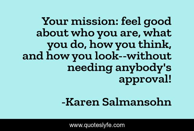 This page presents the quote "Your mission: feel good about who you are, what you do, how you think, and how you look--without needing anybody's approval!". Author of this quote is Karen Salmansohn. This quote is about enthusiasm, inspirational, self-esteem,.