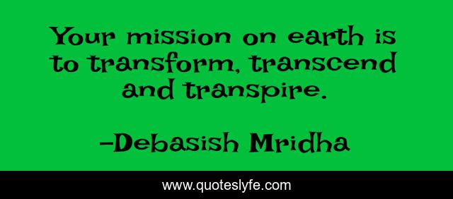 This page presents the quote "Your mission on earth is to transform, transcend and transpire.". Author of this quote is Debasish Mridha. This quote is about transcend, debasish, mridha, philosophy, debasish-mridha, transform, mission, transpire, mission-on-earth,.