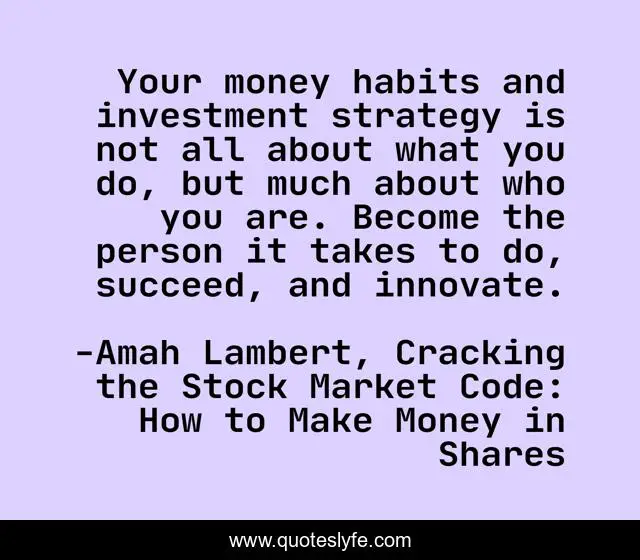 This page presents the quote "Your money habits and investment strategy is not all about what you do, but much about who you are. Become the person it takes to do, succeed, and innovate.". Author of this quote is Amah Lambert, Cracking the Stock Market Code: How to Make Money in Shares. This quote is about motivation, finance, success, wealth-creation, money, strategy, business, habits, innovation,.