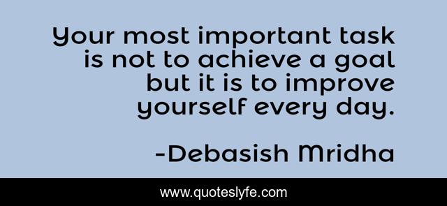 This page presents the quote "Your most important task is not to achieve a goal but it is to improve yourself every day.". Author of this quote is Debasish Mridha. This quote is about achieve-a-goal, life-wisdom, philosophy, debasish-mridha, quotes, improve-yourself-every-day, goals, inspirational, enthusiasm,.