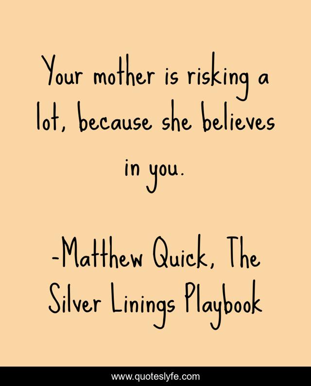 This page presents the quote "Your mother is risking a lot, because she believes in you.". Author of this quote is Matthew Quick, The Silver Linings Playbook. This quote is about faith, love, risk, family, moms, unconditional-love, affection,.