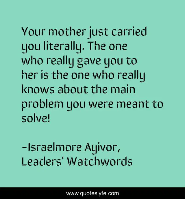 This page presents the quote "Your mother just carried you literally. The one who really gave you to her is the one who really knows about the main problem you were meant to solve!". Author of this quote is Israelmore Ayivor, Leaders' Watchwords. This quote is about caring, love-god, food-for-thought, israelmore-ayivor, creator, fear-god, solution, jehovah, myles-munroe,.