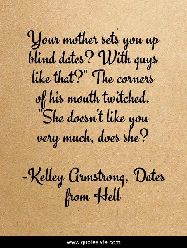 This page presents the quote "Your mother sets you up blind dates? With guys like that?" The corners of his mouth twitched. "She doesn't like you very much, does she?". Author of this quote is Kelley Armstrong, Dates from Hell. This quote is about chaotic, hope, mateson,.