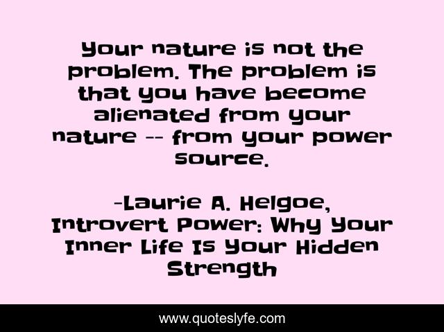This page presents the quote "Your nature is not the problem. The problem is that you have become alienated from your nature -- from your power source.". Author of this quote is Laurie A. Helgoe, Introvert Power: Why Your Inner Life Is Your Hidden Strength. This quote is about enthusiasm, encouragement, inspirational,.