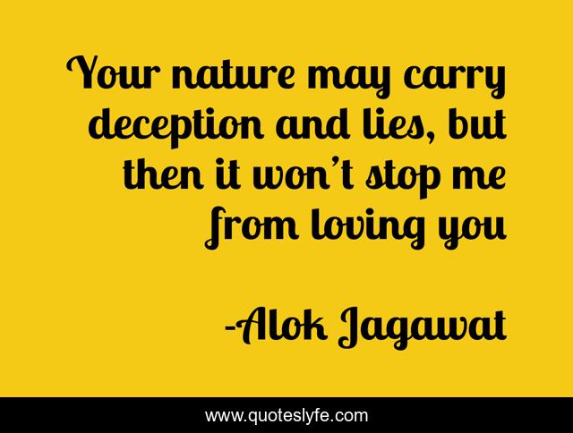 This page presents the quote "Your nature may carry deception and lies, but then it won’t stop me from loving you". Author of this quote is Alok Jagawat. This quote is about lies, deception, loving,.