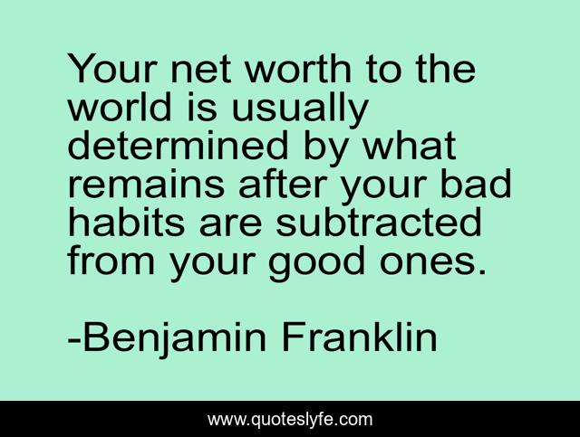 This page presents the quote "Your net worth to the world is usually determined by what remains after your bad habits are subtracted from your good ones.". Author of this quote is Benjamin Franklin. This quote is about world, habits, finance,.