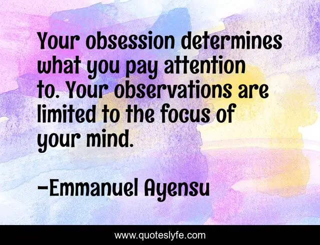 This page presents the quote "Your obsession determines what you pay attention to. Your observations are limited to the focus of your mind.". Author of this quote is Emmanuel Ayensu. This quote is about focus, purpose, inspirational, progress, enthusiasm, vision,.