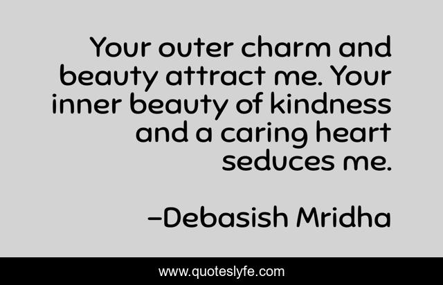 This page presents the quote "Your outer charm and beauty attract me. Your inner beauty of kindness and a caring heart seduces me.". Author of this quote is Debasish Mridha. This quote is about inner-beauty, charm-and-beauty, caring-heart, oscar-wilde, philosophy, debasish-mridha, quotes, miraboli, gandhi,.