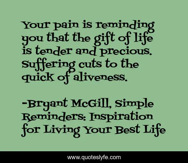 This page presents the quote "Your pain is reminding you that the gift of life is tender and precious. Suffering cuts to the quick of aliveness.". Author of this quote is Bryant McGill, Simple Reminders: Inspiration for Living Your Best Life. This quote is about pain, gift, suffering, remembrance, precious, aliveness,.
