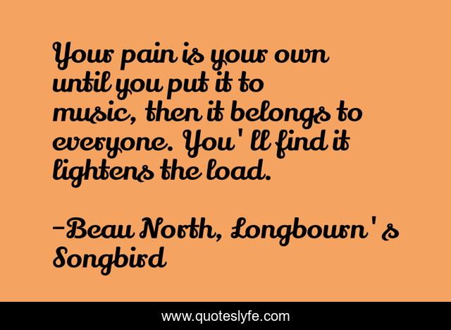 This page presents the quote "Your pain is your own until you put it to music, then it belongs to everyone. You'll find it lightens the load.". Author of this quote is Beau North, Longbourn's Songbird. This quote is about love, music, music-lyrics, affection,.
