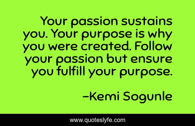 This page presents the quote "Your passion sustains you. Your purpose is why you were created. Follow your passion but ensure you fulfill your purpose.". Author of this quote is Kemi Sogunle. This quote is about living, purpose-in-life, purpose-living, passion, purpose, inspirational, enthusiasm, inspiration,.
