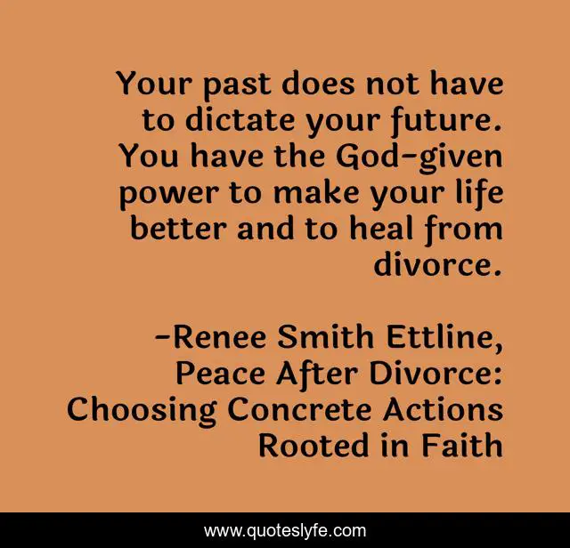 This page presents the quote "Your past does not have to dictate your future. You have the God-given power to make your life better and to heal from divorce.". Author of this quote is Renee Smith Ettline, Peace After Divorce: Choosing Concrete Actions Rooted in Faith. This quote is about divorce, christianity,.