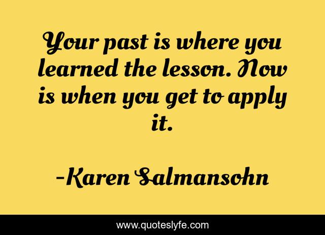 This page presents the quote "Your past is where you learned the lesson. Now is when you get to apply it.". Author of this quote is Karen Salmansohn. This quote is about confidence, positive, motivational, optimistic, inspirational, enthusiasm,.