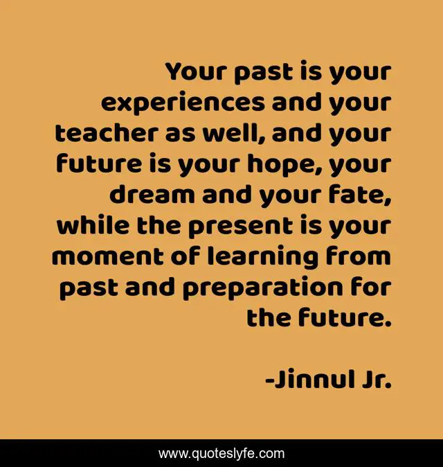 This page presents the quote "Your past is your experiences and your teacher as well, and your future is your hope, your dream and your fate, while the present is your moment of learning from past and preparation for the future.". Author of this quote is Jinnul Jr.. This quote is about fate, past, future, learn, dream, present,.