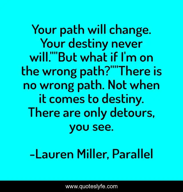 This page presents the quote "Your path will change. Your destiny never will.""But what if I'm on the wrong path?""There is no wrong path. Not when it comes to destiny. There are only detours, you see.". Author of this quote is Lauren Miller, Parallel. .