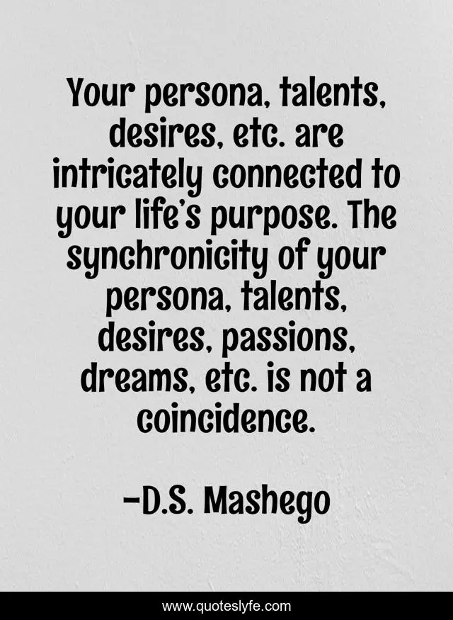This page presents the quote "Your persona, talents, desires, etc. are intricately connected to your life’s purpose. The synchronicity of your persona, talents, desires, passions, dreams, etc. is not a coincidence.". Author of this quote is D.S. Mashego. This quote is about motivation, talents, passion, purpose, dreams, inspiration,.