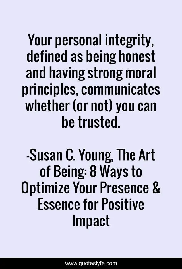 This page presents the quote "Your personal integrity, defined as being honest and having strong moral principles, communicates whether (or not) you can be trusted.". Author of this quote is Susan C. Young, The Art of Being: 8 Ways to Optimize Your Presence & Essence for Positive Impact. This quote is about confidence, susan-young, relationship, communication-skills, communication, first-impressions, authenticity, trust, integrity,.