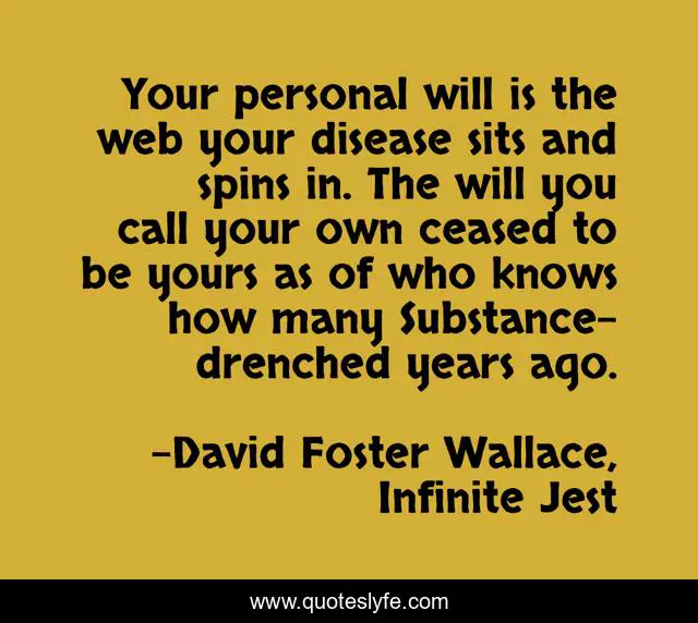 This page presents the quote "Your personal will is the web your disease sits and spins in. The will you call your own ceased to be yours as of who knows how many Substance-drenched years ago.". Author of this quote is David Foster Wallace, Infinite Jest. This quote is about drugs, free-will,.