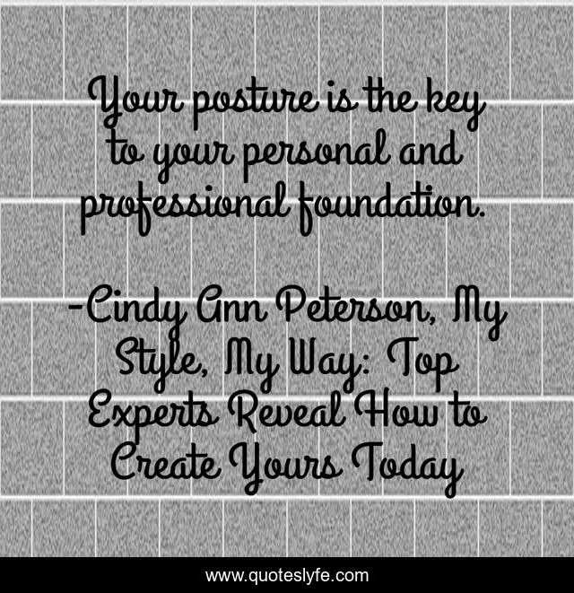 This page presents the quote "Your posture is the key to your personal and professional foundation.". Author of this quote is Cindy Ann Peterson, My Style, My Way: Top Experts Reveal How to Create Yours Today. This quote is about organized, attitude, key-to-success, confidence, author, enthusiasm, non-verbal-communication, cindy-ann-peterson, foundation,.