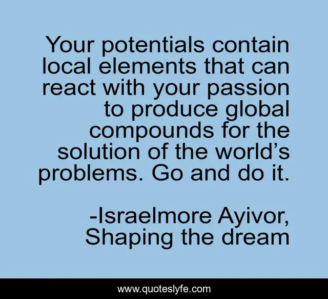 This page presents the quote "Your potentials contain local elements that can react with your passion to produce global compounds for the solution of the world’s problems. Go and do it.". Author of this quote is Israelmore Ayivor, Shaping the dream. This quote is about globe, compound, potent, global, go, laboratory, localized, food-for-thought, potential,.