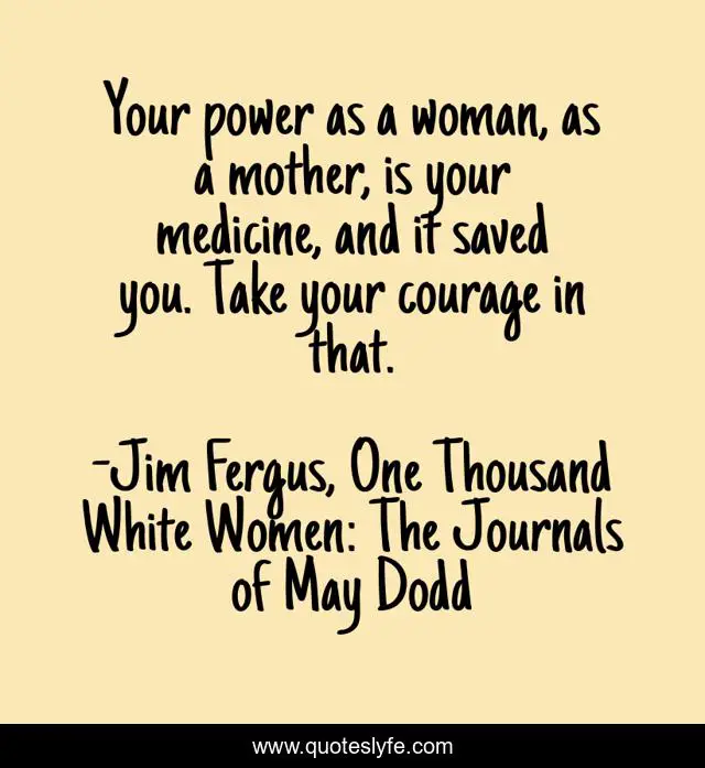 This page presents the quote "Your power as a woman, as a mother, is your medicine, and it saved you. Take your courage in that.". Author of this quote is Jim Fergus, One Thousand White Women: The Journals of May Dodd. This quote is about motherhood, the-power-of-women,.