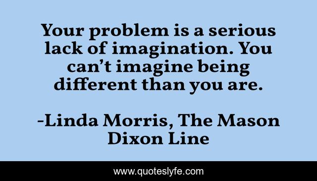 This page presents the quote "Your problem is a serious lack of imagination. You can’t imagine being different than you are.". Author of this quote is Linda Morris, The Mason Dixon Line. This quote is about new-adult, romance, humor,.