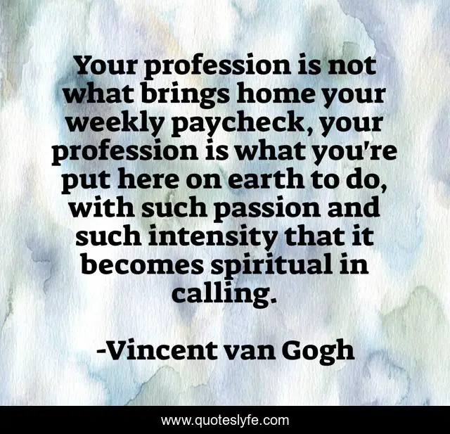 This page presents the quote "Your profession is not what brings home your weekly paycheck, your profession is what you're put here on earth to do, with such passion and such intensity that it becomes spiritual in calling.". Author of this quote is Vincent van Gogh. This quote is about paycheck, profession, calling,.