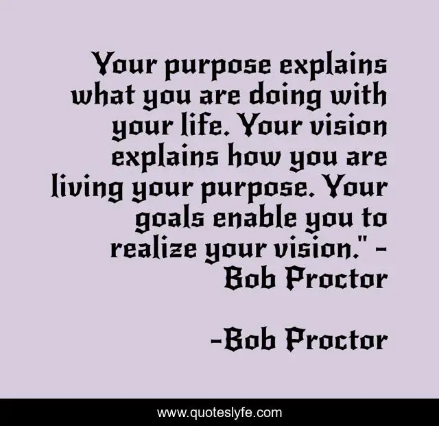 Your purpose explains what you are doing with your life. Your vision explains how you are living your purpose. Your goals enable you to realize your vision." - Bob Proctor