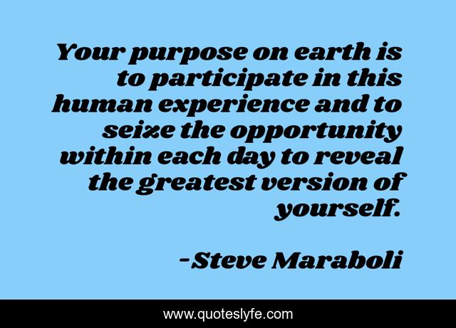This page presents the quote "Your purpose on earth is to participate in this human experience and to seize the opportunity within each day to reveal the greatest version of yourself.". Author of this quote is Steve Maraboli. This quote is about enthusiasm, life, experience, inspirational, purpose,.