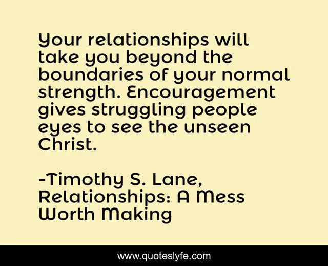 This page presents the quote "Your relationships will take you beyond the boundaries of your normal strength. Encouragement gives struggling people eyes to see the unseen Christ.". Author of this quote is Timothy S. Lane, Relationships: A Mess Worth Making. .