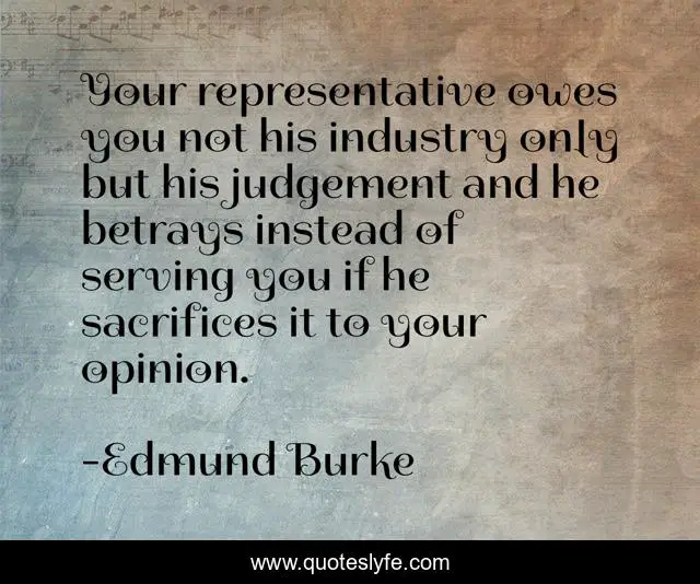 This page presents the quote "Your representative owes you not his industry only but his judgement and he betrays instead of serving you if he sacrifices it to your opinion.". Author of this quote is Edmund Burke. .