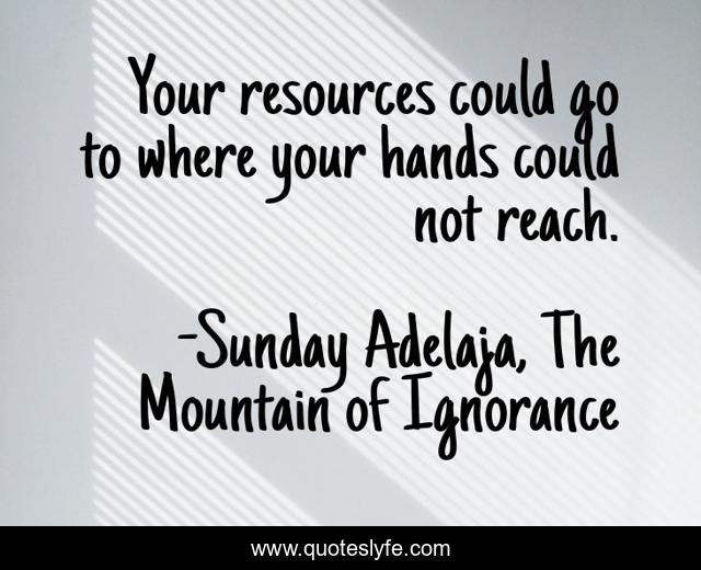 This page presents the quote "Your resources could go to where your hands could not reach.". Author of this quote is Sunday Adelaja, The Mountain of Ignorance. This quote is about mountain, life, darkness, power, danger, light, hands, people, ignorance,.