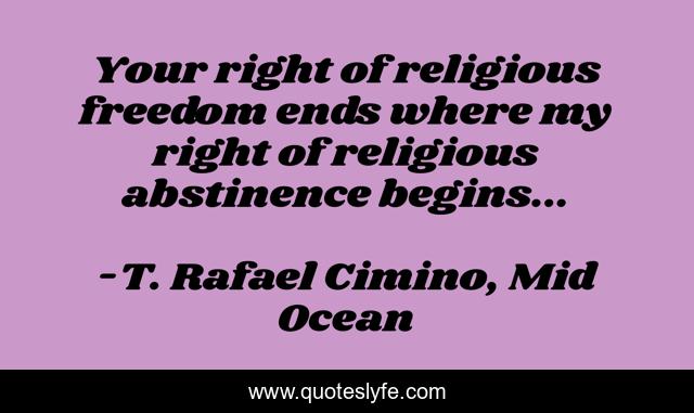 This page presents the quote "Your right of religious freedom ends where my right of religious abstinence begins...". Author of this quote is T. Rafael Cimino, Mid Ocean. This quote is about states-rights, religious-faith, romance, religion, politicians, political-philosophy, church, politics, religious,.