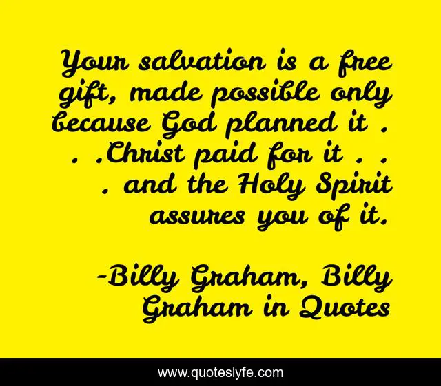 This page presents the quote "Your salvation is a free gift, made possible only because God planned it . . .Christ paid for it . . . and the Holy Spirit assures you of it.". Author of this quote is Billy Graham, Billy Graham in Quotes. This quote is about salvation, billy-graham,.