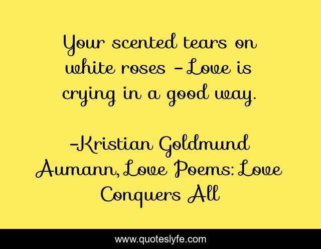 This page presents the quote "Your scented tears on white roses - Love is crying in a good way.". Author of this quote is Kristian Goldmund Aumann, Love Poems: Love Conquers All. This quote is about love, affection,.