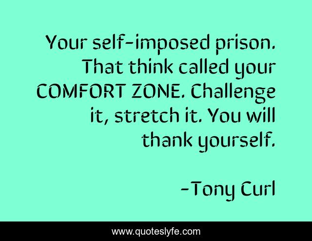 This page presents the quote "Your self-imposed prison. That think called your COMFORT ZONE. Challenge it, stretch it. You will thank yourself.". Author of this quote is Tony Curl. This quote is about life, strength, positive, motivational, confidence, growth, optimistic, comfort-zone,.