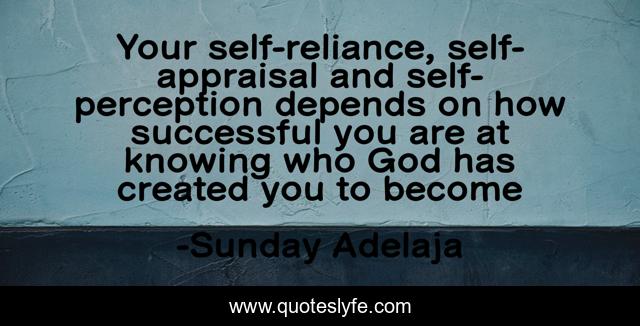 This page presents the quote "Your self-reliance, self-appraisal and self- perception depends on how successful you are at knowing who God has created you to become". Author of this quote is Sunday Adelaja. This quote is about god, self-appraisal, self-reliance, success, self-perception,.