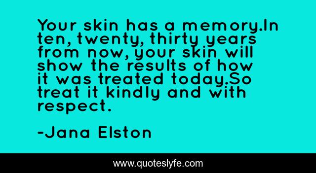 This page presents the quote "Your skin has a memory.In ten, twenty, thirty years from now, your skin will show the results of how it was treated today.So treat it kindly and with respect.". Author of this quote is Jana Elston. This quote is about beauty, wellbeing, aestherics, skincare, health, skin, beauty-tips,.