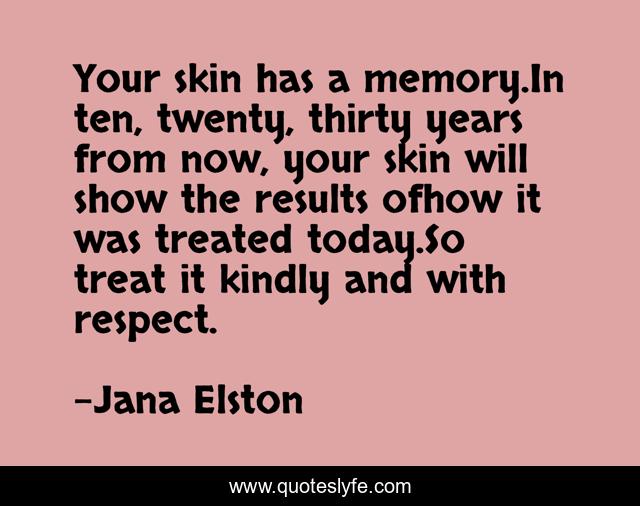 This page presents the quote "Your skin has a memory.In ten, twenty, thirty years from now, your skin will show the results ofhow it was treated today.So treat it kindly and with respect.". Author of this quote is Jana Elston. This quote is about aesthetics, beauty, wellbeing, cosmetic, skincare, skin-tips, health, inspirational, skin,.