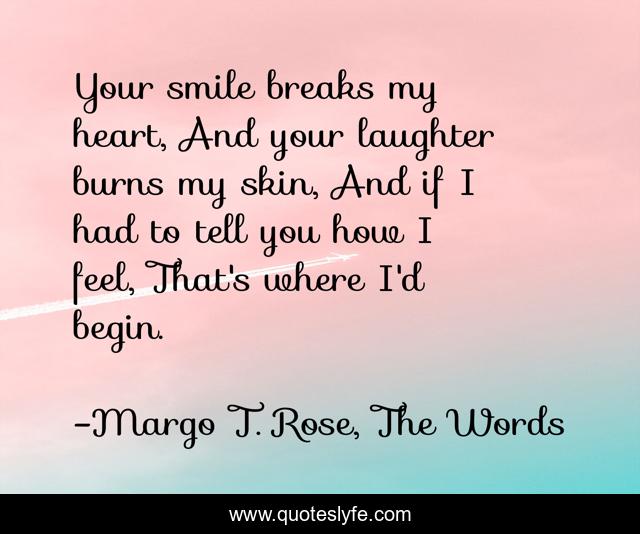 This page presents the quote "Your smile breaks my heart, And your laughter burns my skin, And if I had to tell you how I feel, That's where I'd begin.". Author of this quote is Margo T. Rose, The Words. This quote is about heart, begin, love, feel, beginning, feelings, heartbreak, affection, smile,.